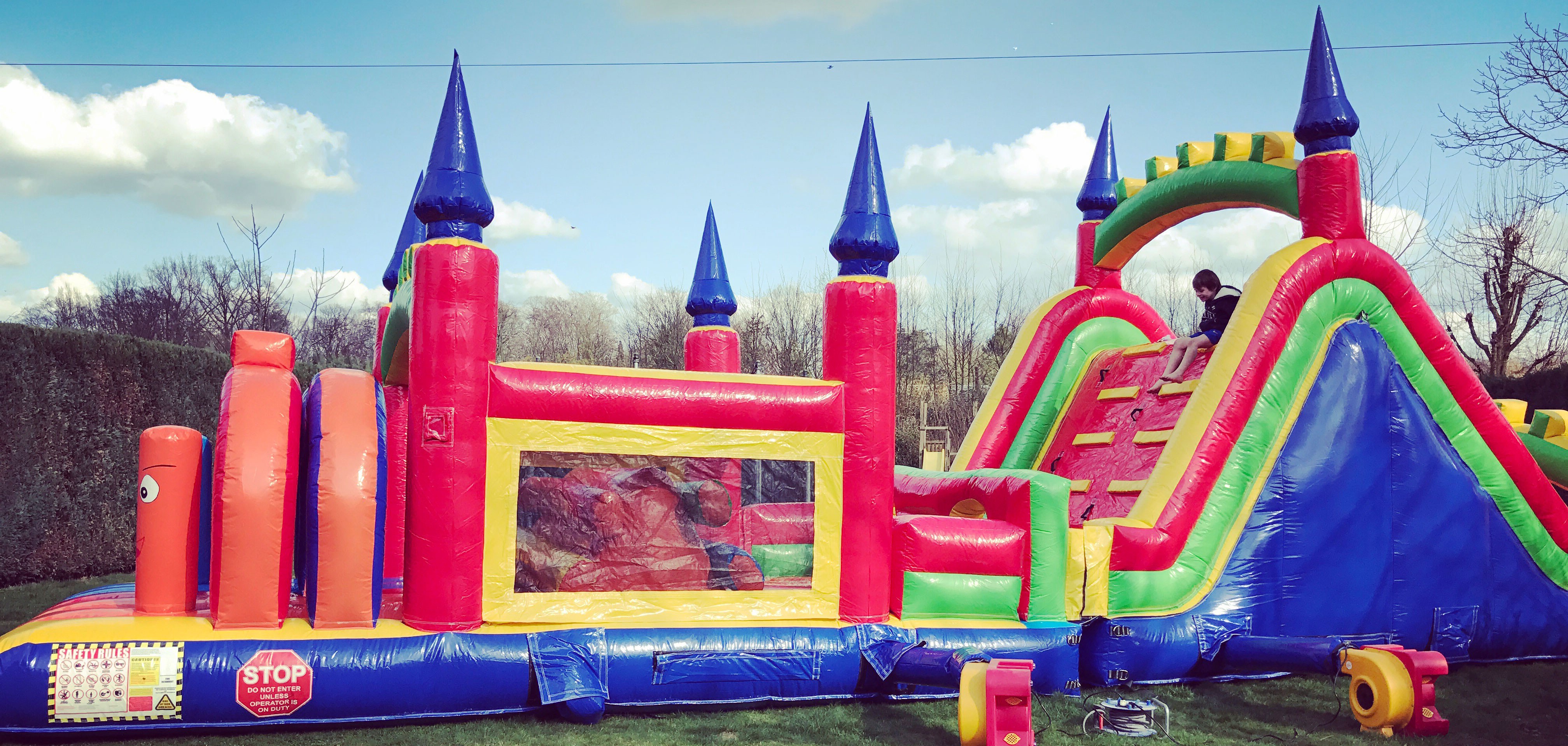 Een 12m lange hindernisbaan met een 4m hoge glijbaan. Ideaal voor grotere tuinen en straatfeesten.